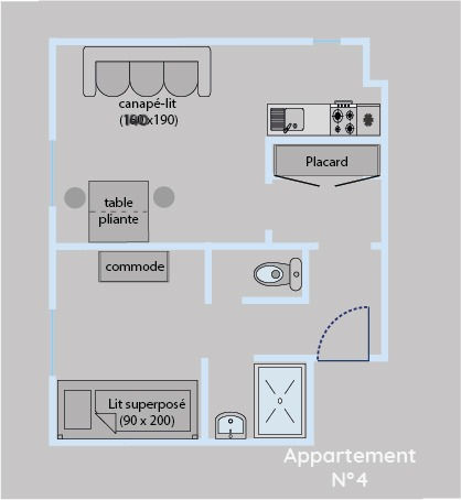 Cet appartement possède 1 chambre avec 1 lit superposé de 90 x 200 cm, 1 salle de bains avec douche, 1 WC, 1 pièce à vivre avec 1 canapé lit de 140 x 190 cm (ultra confort couchage hôtel), 1 table et des chaises, une télévision et une cuisine équipée (voir ci dessous les équipements)